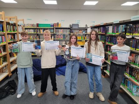 Am Mittwoch, den 17. Dezember 2025, wurde in der Schulbibliothek der Schulentscheid des englischen Vorlesewettbewerbs durchgeführt. Als jeweilige Klassensieger der 7. Jahrgangsstufe traten Emma Kuchinke (7a), Felix Renschin (7b), Philipp Rech (7c), Leni von Akerman (7d) und Justus Pfeffer (7e) im Beisein der Unterstützer aus ihren Klassen gegeneinander an.