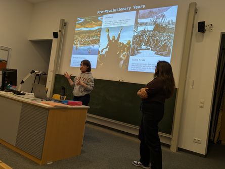 Im Rahmen ihres dreiwöchigen Aufenthalts an unserer Schule im Januar 2026, gestalteten die beiden im Geographieunterricht von Frau Posch eine fesselnde Stunde zum Thema Immigration in den USA. In der komplett auf Englisch gehaltenen Stunde nahmen sie die Schülerinnen und Schüler mit auf eine Zeitreise – von den ersten kolonialen Anfängen um 1600 bis hin zu den komplexen Herausforderungen der Gegenwart. Besonders intensiv wurden die aktuellen Entwicklungen und die kontroverse Einwanderungspolitik unter Donald Trump diskutiert.