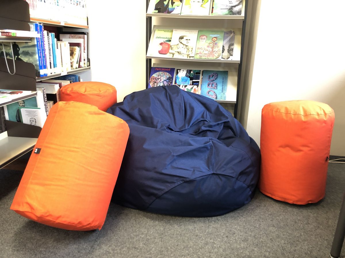 Im vorderen Raum wurde der Bereich der Belletristik in den Mittelpunkt gerückt und auch der Bestand an fremdsprachiger Belletristik ist nun übersichtlich zu finden. Einige flexible Regale ermöglichen es einerseits, sich beispielsweise in den Pausen zum Schmökern niederzulassen. Andererseits kann Freiraum geschaffen werden, damit der Bibliotheksbesuch einer ganzen Gruppe oder Klasse nun in sinnvoller Weise möglich ist.